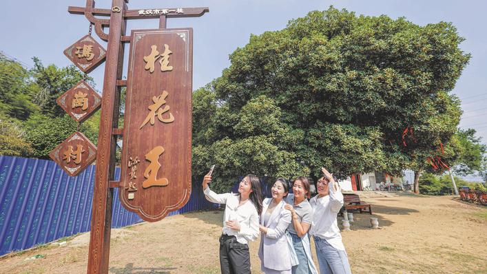 近几天,每天都有一波波游客来亲近这棵桂花王,胡爹爹家门前变得特别热闹,看着游客们欢颜一笑,他也乐在心里!