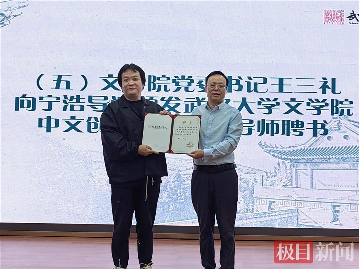 当日,武汉大学党委常务副书记沈壮海,向宁浩导演颁发了武汉大学兼职教授聘书。武大文学院党委书记王三礼,向宁浩导演颁发了武汉大学文学院中文创意写作行业导师聘书。