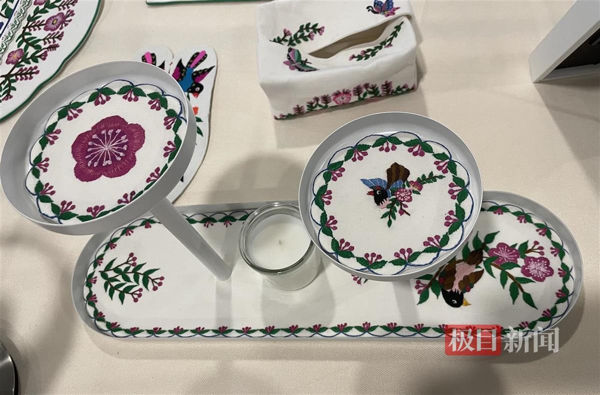 极目新闻记者在成果展现场看到,一系列以“喜鹊闹梅”为主题的产品呈现在观众面前,让田园气息浓郁的“喜鹊闹梅”,变成了更符合年轻人审美的时尚单品,吸引了不少观众驻足、询价。