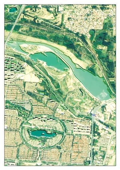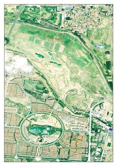 2014.06.07卫星对比图 永定河流经廊坊市兴安湖生态运动公园,河道狭窄,河床被开垦成农田。