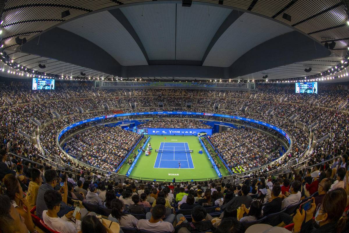 10月13日晚,光谷国际网球中心中央球场座无虚席,达到容纳极限的1.3万名球迷见证武网女单夺冠之夜。 (湖北日报全媒记者 魏铼 摄)