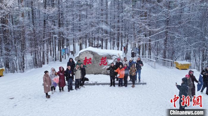 10月14日,“神州北极”漠河市迎来暴雪天气。图为游客在漠河市赏雪、玩雪。 漠河市委宣传部供图