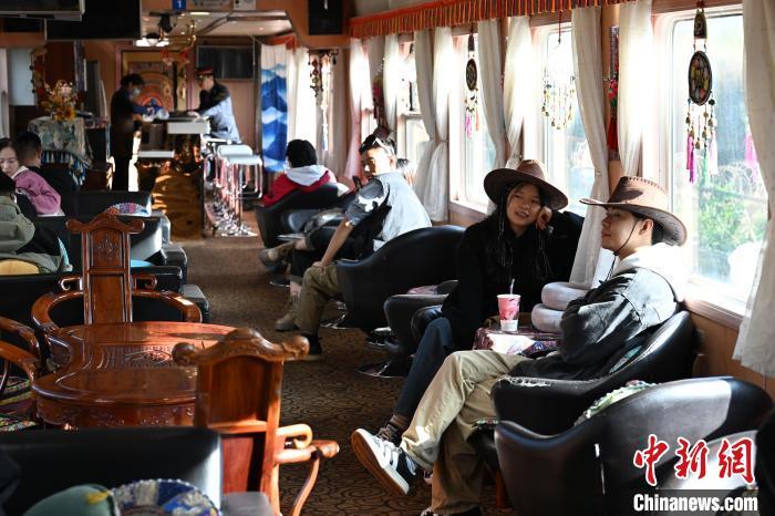 10月14日,列车从丽江前往大理的路上,旅客悠闲享受云南的阳光和窗外美景。中新社记者 刘冉阳 摄