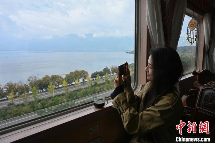 10月14日,列车经过大理洱海,乘客拍下窗外美景。中新社记者 刘冉阳 摄