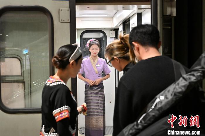 列车内的装饰别具特色,将云南的民族文化融入车厢的各个细节,旅客可以在旅途中感受不一样的云南之美。图为10月13日晚,身着民族服饰的乘务员迎接登车旅客。中新社记者 刘冉阳 摄