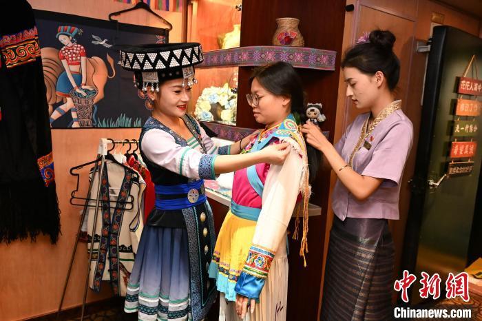 该列车自2014年至今已开行了10年,运送旅客超千万人次,其高品质的硬件配置和独具特色的服务深受旅客喜爱,成为推介云南旅游的窗口。图为10月13日晚,一名旅客(中)在乘务员的辅助下试穿云南民族服装。中新社记者 刘冉阳 摄