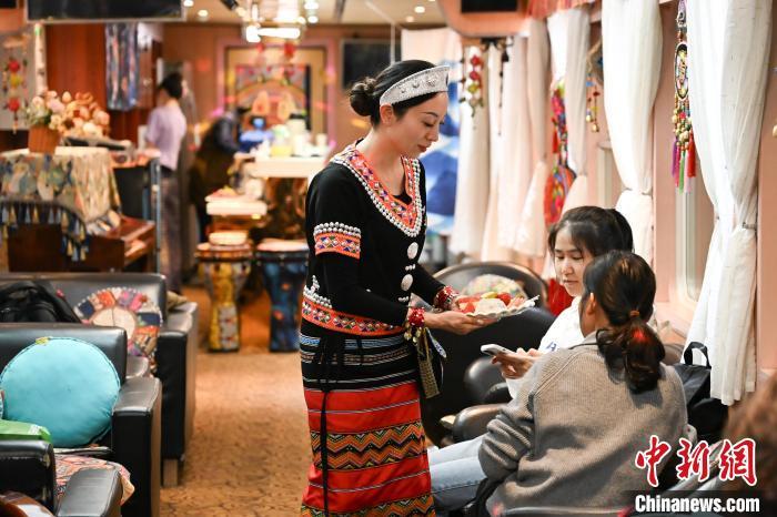 Y752/754次列车是中国铁路昆明局集团有限公司昆明客运段值乘的特色旅游列车,采用双层客车车厢设计,每晚从昆明站出发,次日清晨抵达丽江站后列车改变车次,往返于丽江至大理间。图为10月13日晚,身着民族服饰的乘务员为旅客提供服务。中新社记者 刘冉阳 摄