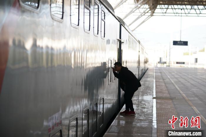 10月14日,列车抵达丽江站,乘客在站台打卡双层列车。中新社记者 刘冉阳 摄