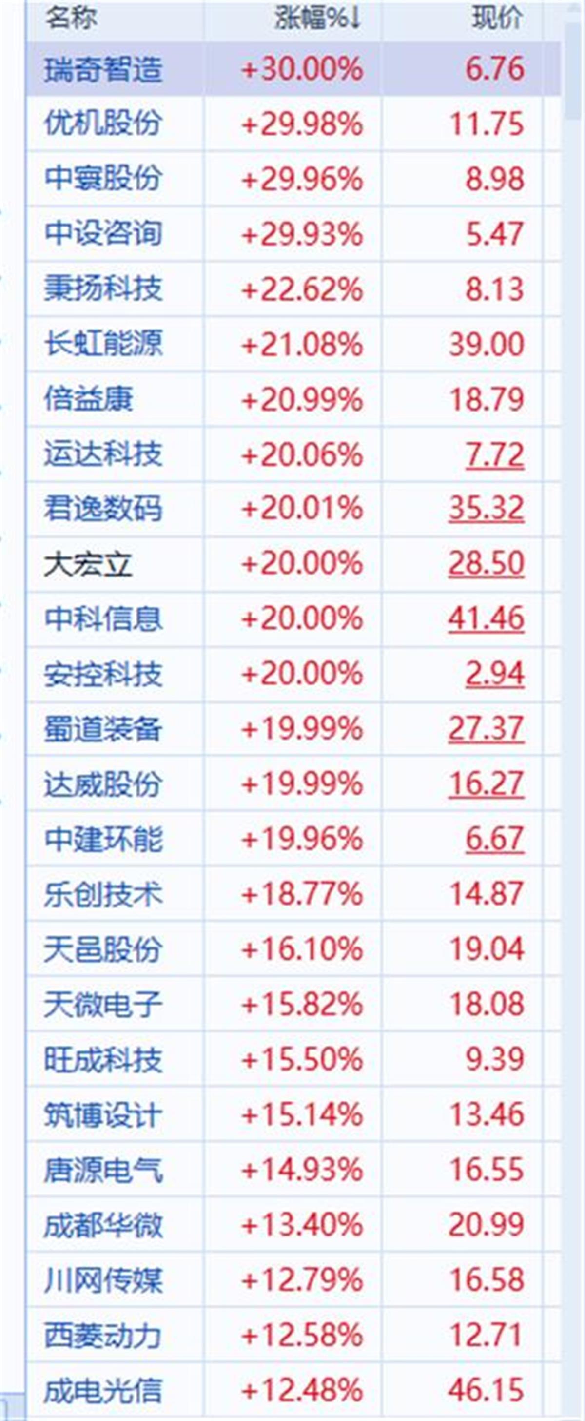 作为西部大开发的分支,今天,成渝板块是西部大开发中走势较强的板块,在大盘围绕3200点反复拉锯的背景下,该板块狂涨6%,涨停及以上涨幅个股近50只。瑞奇智造、优机股份等30%涨停,中建环能、安控科技、大宏立等出现20%涨停。