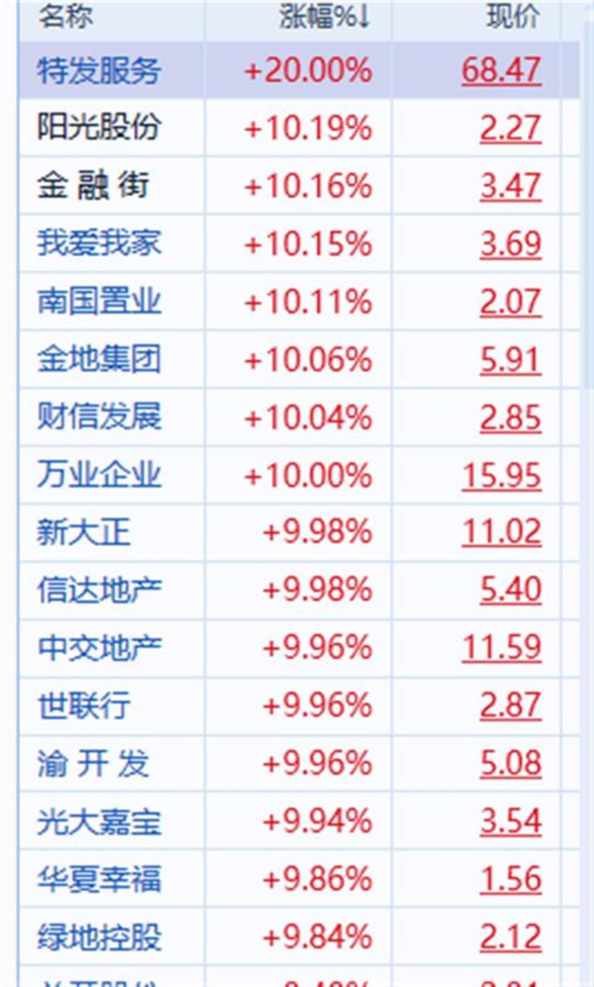 同花顺房地产板块涨停一览