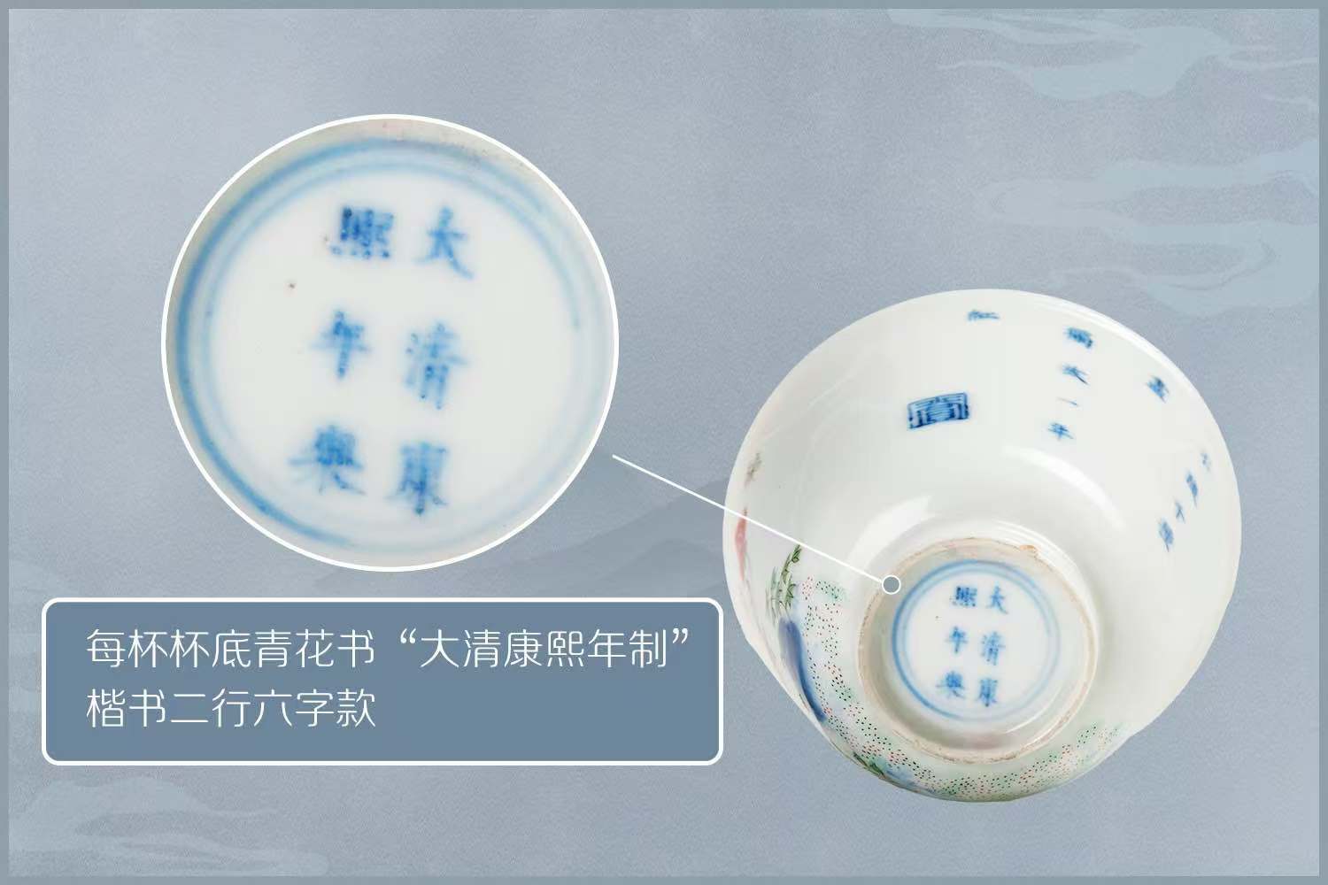 《陶雅》有赞曰:“康熙十二月花卉酒杯,一杯一花,有青花、有五彩,质地甚薄,铢两自轻。……若欲凑合十二月之花,诚戛戛乎其难。青花价值,且亦不甚相悬也。”