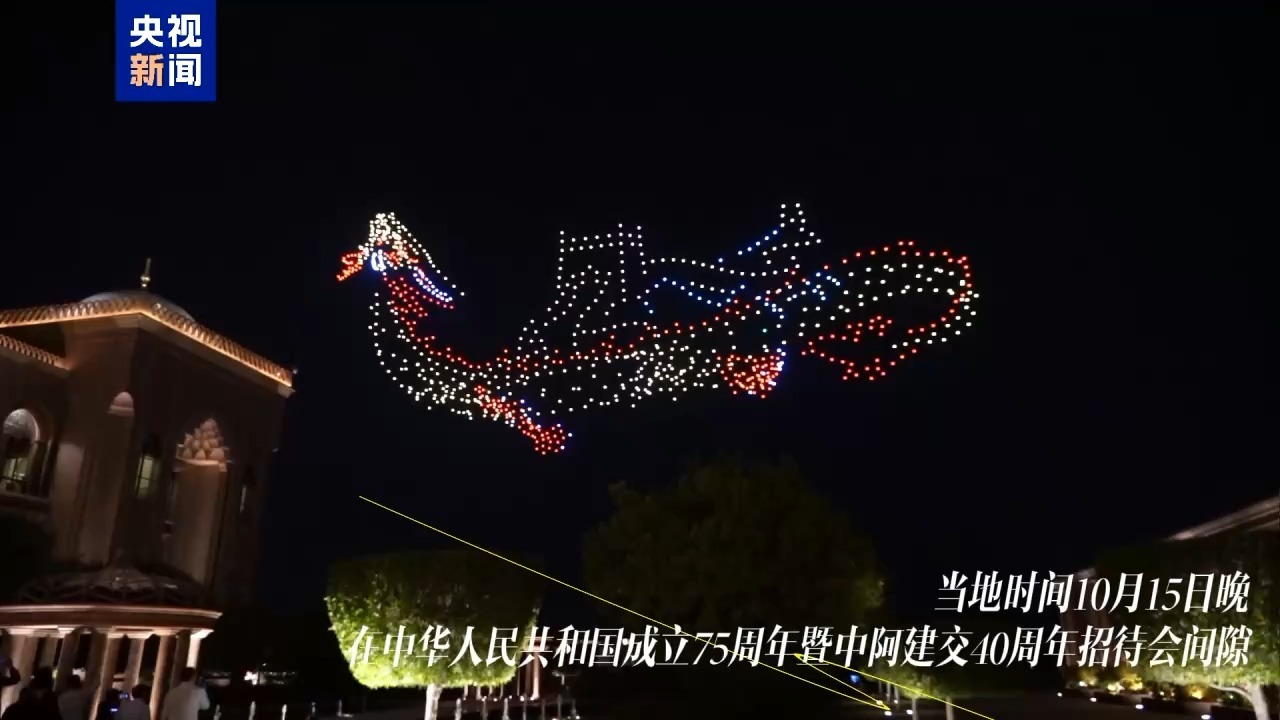 1000架无人机组成的编队在夜空中闪亮登场,先后展现中阿两国国旗、长城、清真寺等一系列极富两国特色的元素,表达了对中华人民共和国成立75周年和中国阿联酋建交40周年的美好祝福。