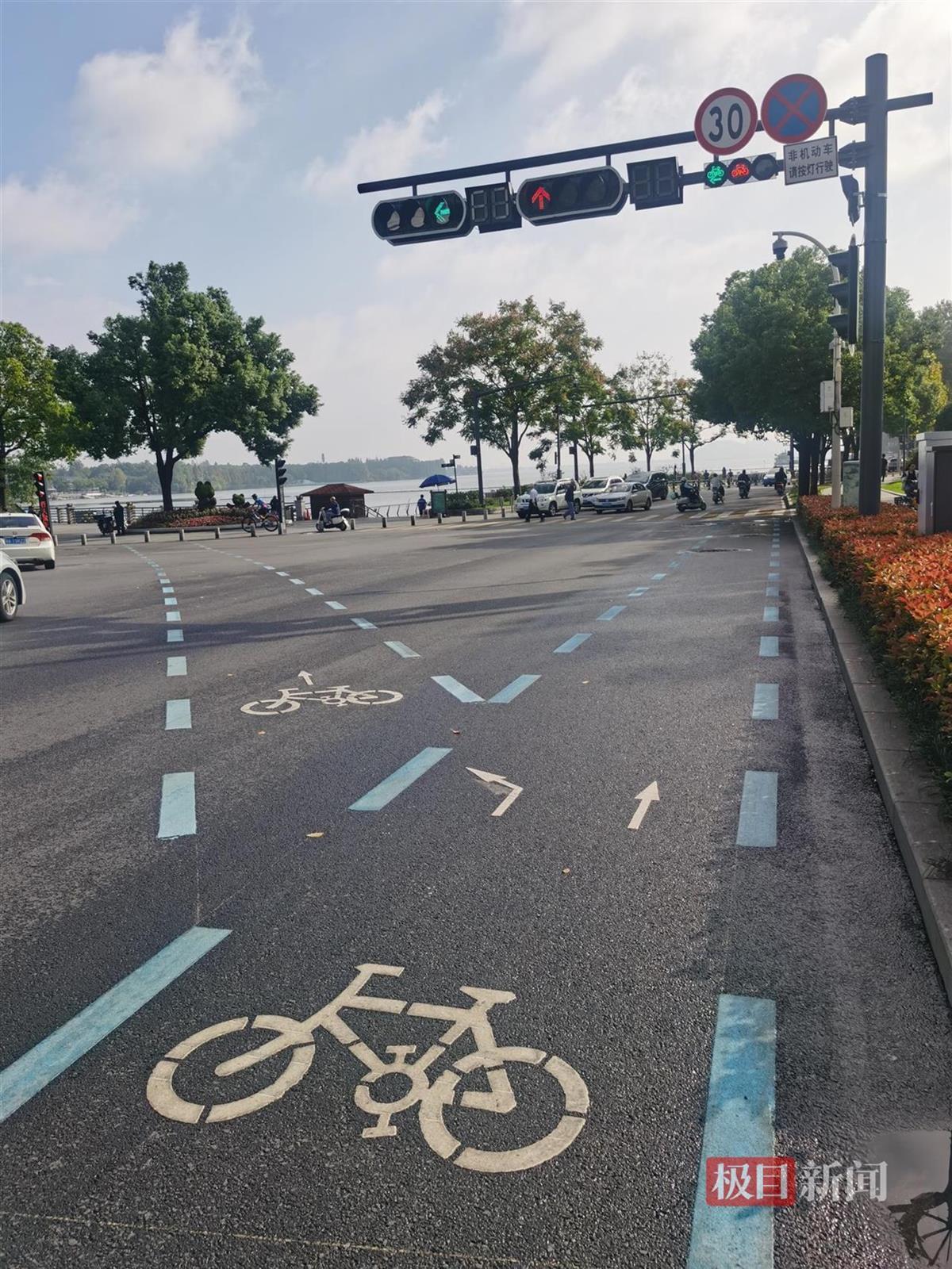 10月18日早晨,在武汉市武昌区洪山路天鹅路路口,家住附近的肖先生看到,与以前不同,这里新划了非机动车标线,还多了带有自行车图案的信号灯。