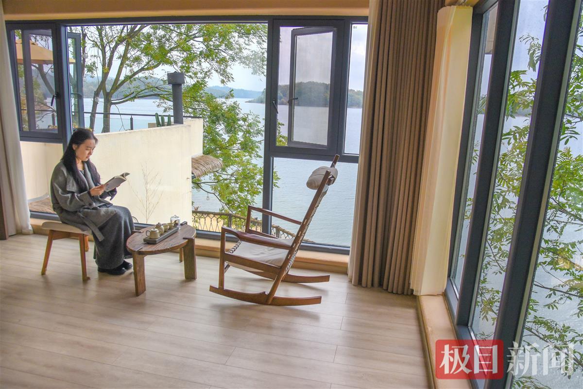 10月17日,在随州市随县大洪山水库琵琶湖景区的水无声民宿,游客在悠闲品茶、阅读
