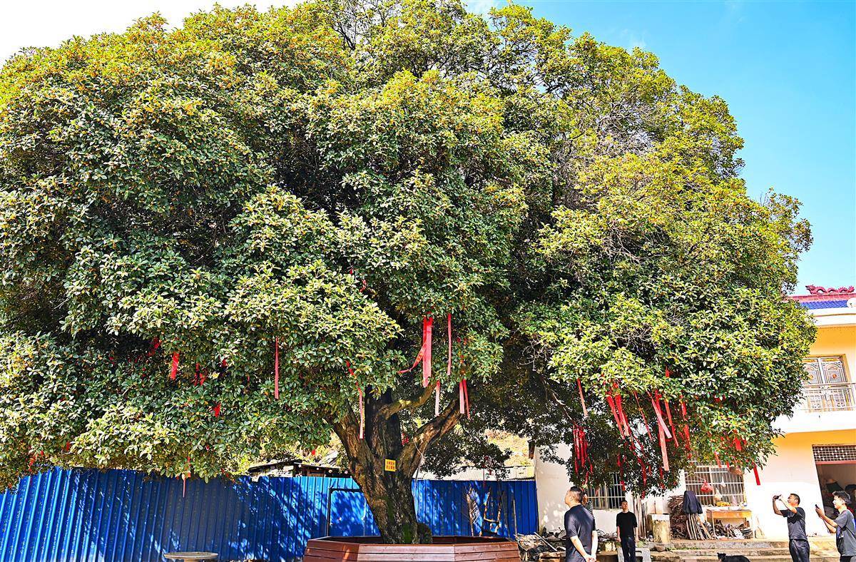 10月18日,武汉新洲区旧街街道冯岗村石洞塆一株300岁的“桂花王”已进入盛花期,许多市民游客慕名而来。这株“桂花王”高约11米、胸径0.76米,需要两名成年人才能合抱。