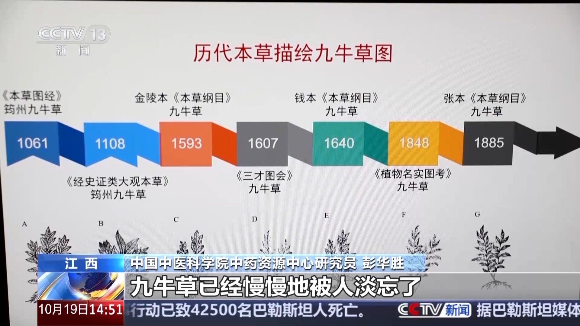 中国中医科学院中医药健康产业研究所所长 李慧:文字记载是人们了解历史、了解文化的重要途径,古人用中药防病治病,并且用典籍记载下来,因此后人能有所参照。比如在宋代到明代的很多典籍当中,都记载了九牛草具有散寒止痛、温经止血的功效。