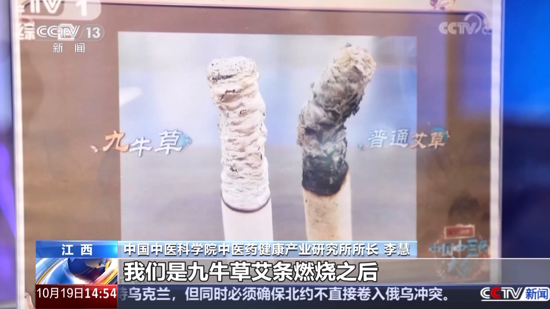 中国中医科学院中医药健康产业研究所所长 李慧:我手上的是九牛草制成的灸条,这是其他品种的艾草艾条,九牛草艾条燃烧之后,它的烟是非常轻的,几乎没有什么烟,然后这个是一个比较浓黑的,而且烟量烟气也比较大,说明九牛草的燃烧也是非常充分的,这是作为优质灸材应该具备的。
