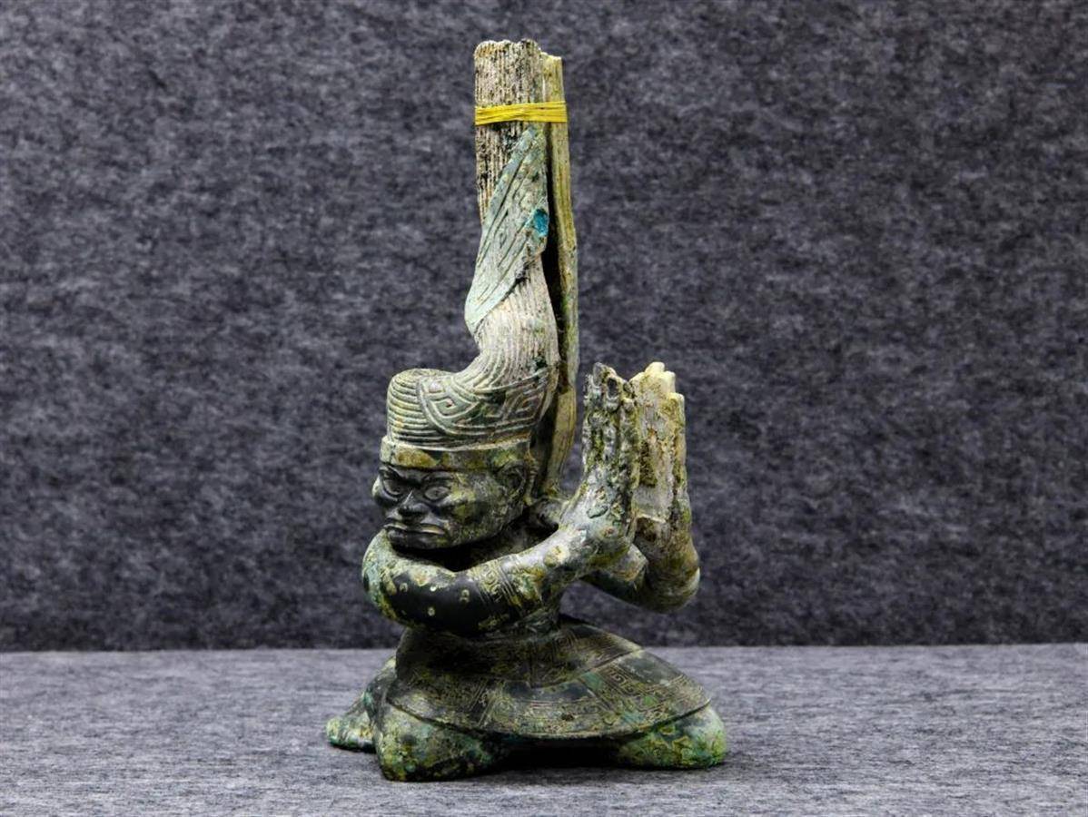 黎海超展示了一个青铜扭头跪坐人像图片,黎海超在写文物报告时采用“极强的负重感”来形容该青铜人像的表情。“这个器物很重要,从外观看,这是一个非常典型的中国境内人种形象,刻画清晰,也侧面说明三星堆的人群属性。”