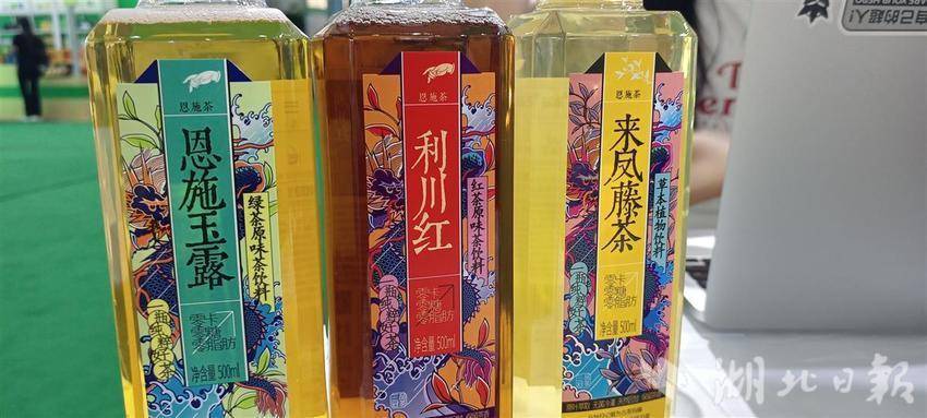 走进展会现场,一眼就能看到“恩施玉露”“利川红”“来凤藤茶”即饮类茶饮料产品组成的展示墙,大家小纸杯品尝着原味茶饮,工作人员热情地介绍。