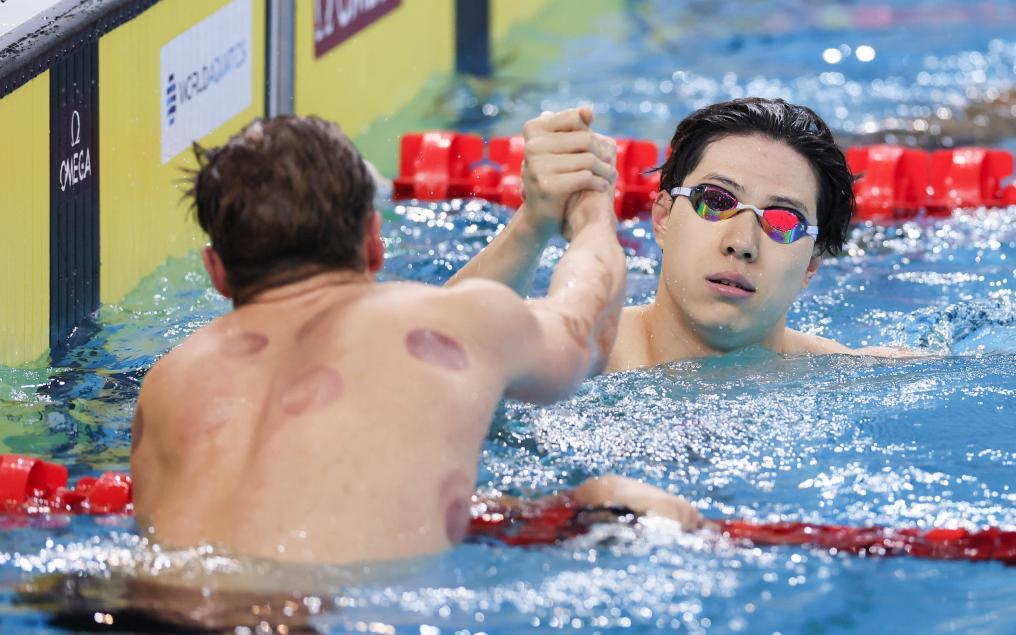 10月19日,中国选手覃海洋(右)在夺冠后。新华社记者 王翔 摄