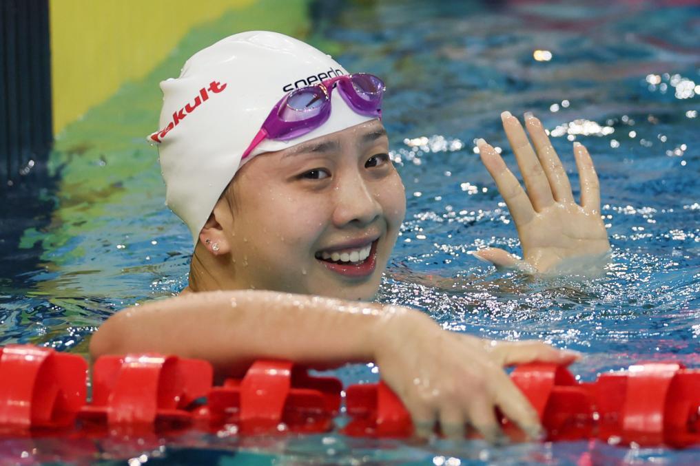 10月19日,唐钱婷夺冠后向观众挥手致意。当日,在2024世界泳联游泳世界杯(上海站)女子100米蛙泳决赛中,中国选手唐钱婷获得冠军。新华社记者 王翔 摄