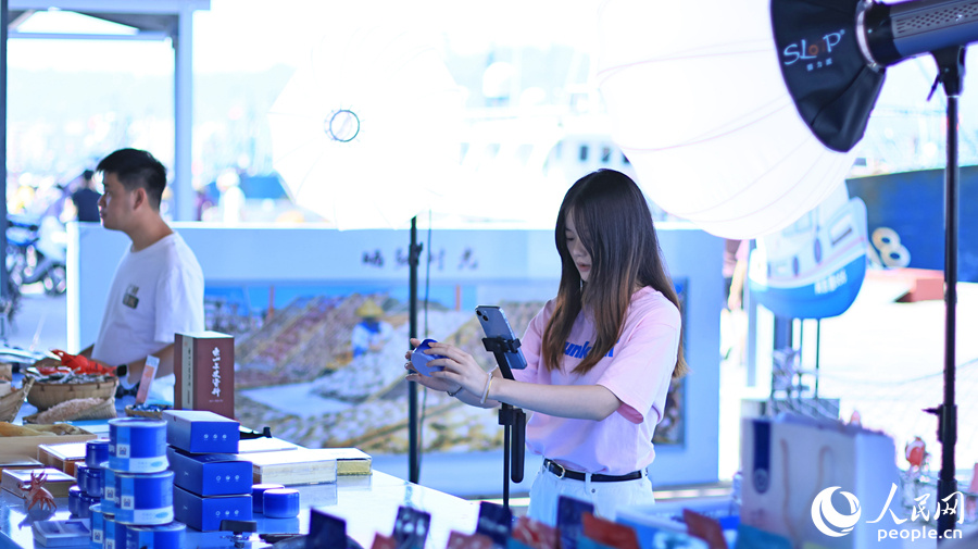 网络主播正在推介当地海鲜加工产品。人民网 李昌乾摄