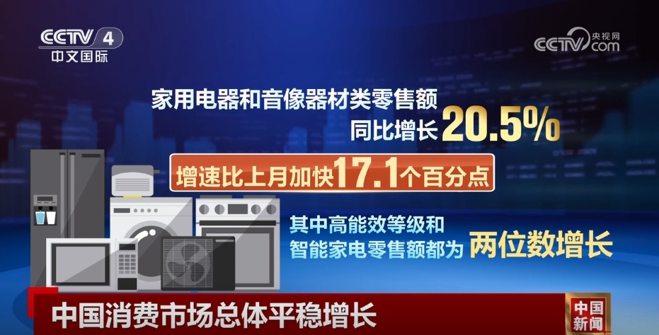 今年以来,我国加力推动消费品以旧换新,拉动汽车、家电等相关商品的销售。9月份,家用电器和音像器材类商品今年首次实现20%以上的高增长,零售额同比增长20.5%,增速比上月加快17.1个百分点,其中高能效等级和智能家电零售额都为两位数增长。在此带动下,三季度的社会消费品零售总额增速比二季度加快0.1个百分点。