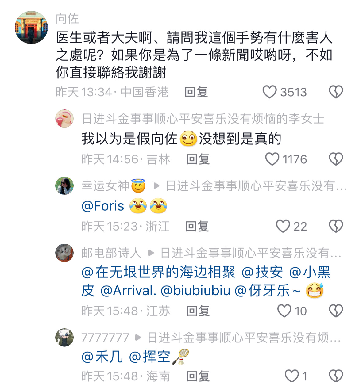 视频一经发出,向佐直接冲进评论区,本人亲自回复:医生或者大夫啊,请问我这个手势有什么害人之处呢?如果你是为了一条新闻,哎哟呀,不如你直接联络我谢谢。