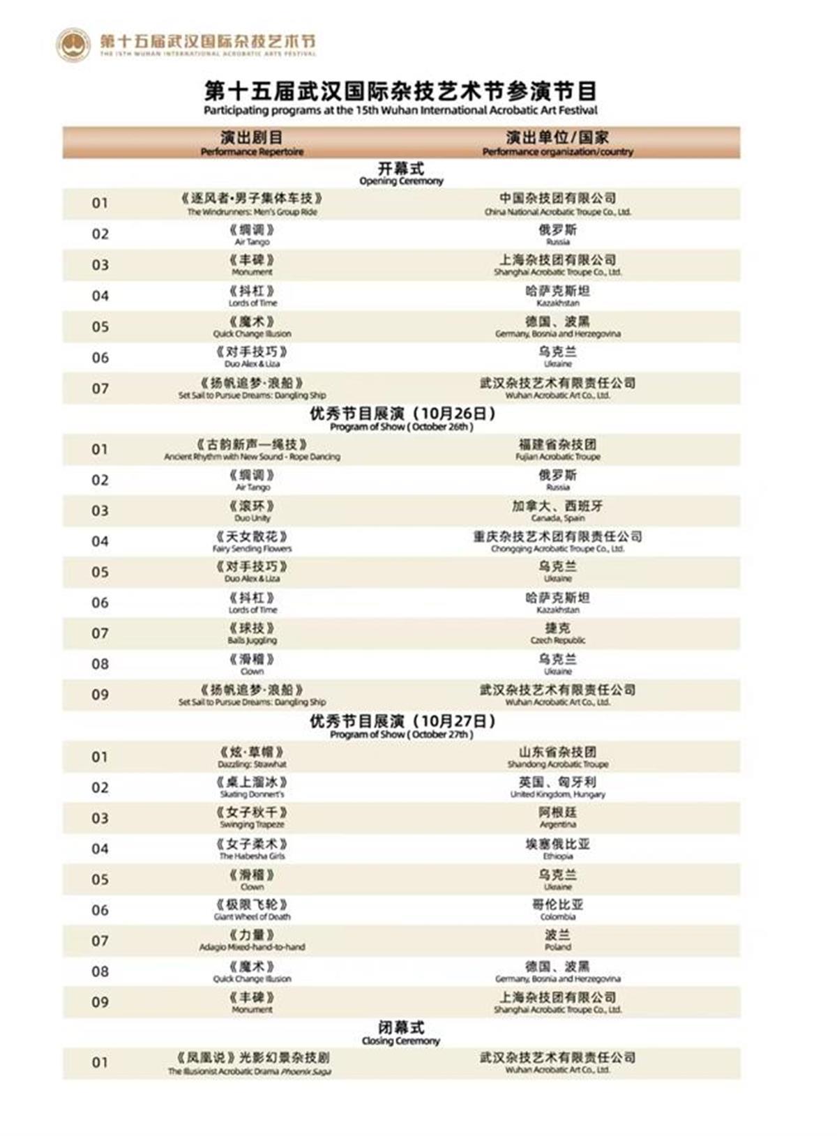 第十五届武汉国际杂技艺术节开幕演出为杂技节目精品晚会,闭幕演出为武汉杂技团新创的光影幻景杂技剧《凤凰说》,共6场演出活动。展演期间,还将举办专家点评会、杂技“四进”等配套活动。