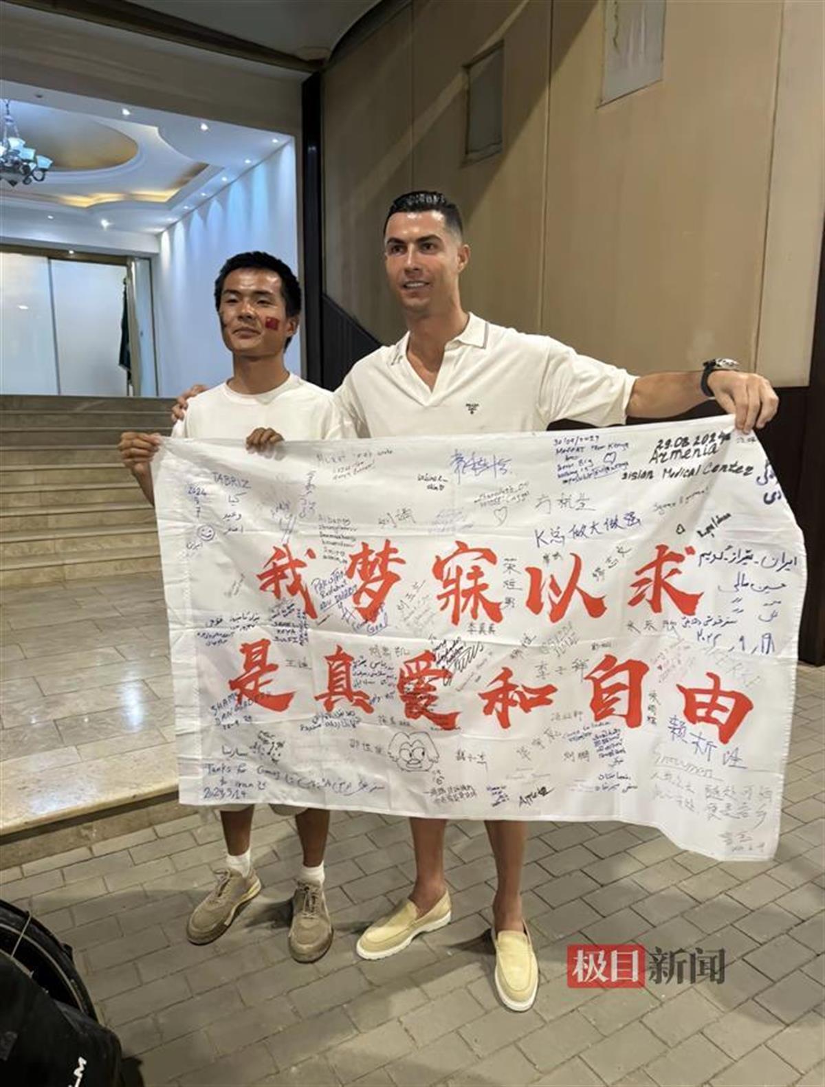 记者注意到,C罗签字的横幅上写着中文“我梦寐以求,是真爱和自由”,还有密密麻麻的签名。据小宫介绍,这是很多朋友的名字,他们也都是C罗的粉丝。在签名合照时,自己心跳得飞快,直到合完影还觉得是在做梦。