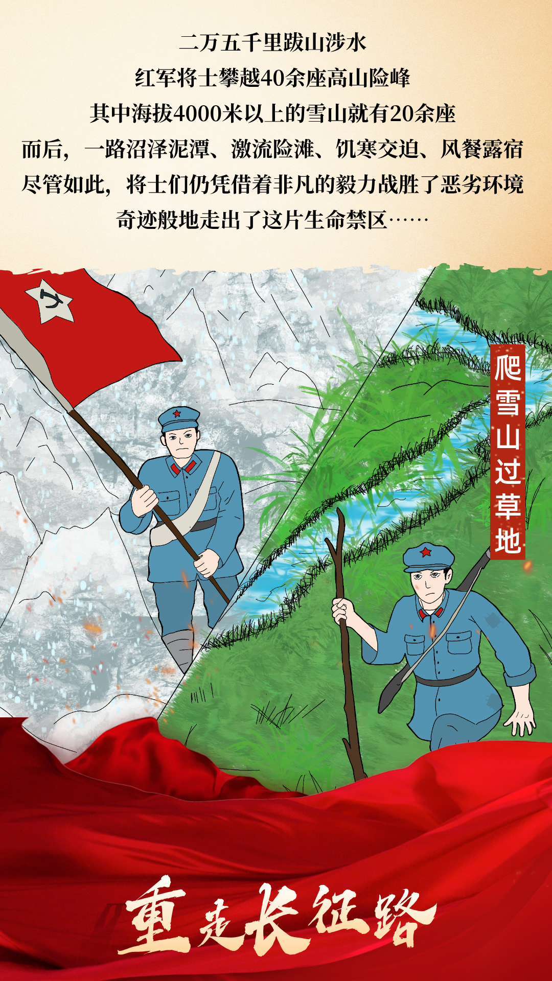 红军战士们勇攀雪山之巅,穿越茫茫草地