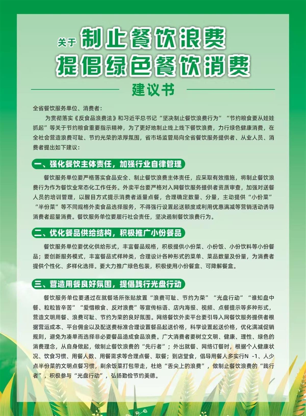 广大消费者要树立文明、健康、理性、绿色的消费理念,从自身做起,做制止餐饮浪费的“先行者”;外出就餐、网络订餐时,根据个人健康状况、饮食习惯、用餐人数、用餐需求等合理点餐、取餐;到店堂食,倡导用餐人多实行N-1、人少点半份菜的文明点餐习惯,剩余饭菜打包带走,杜绝“舌尖上的浪费”,做制止餐饮浪费的“践行者”,积极参与“光盘行动”,弘扬勤俭节约美德。