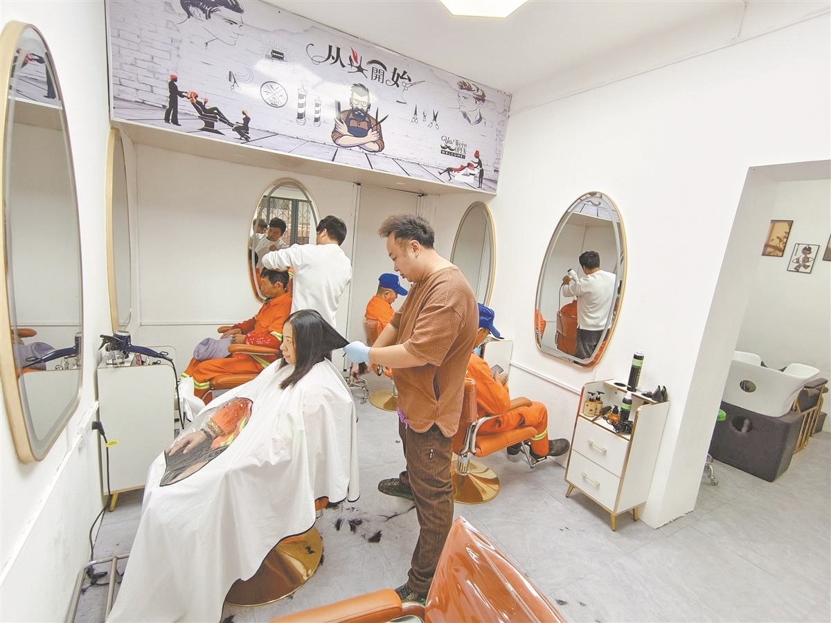 “欢迎、欢迎。”10月22日,美发店来了刚下早班的4名环卫工及一名共享单车运维员。李明带着店员笑脸相迎。
