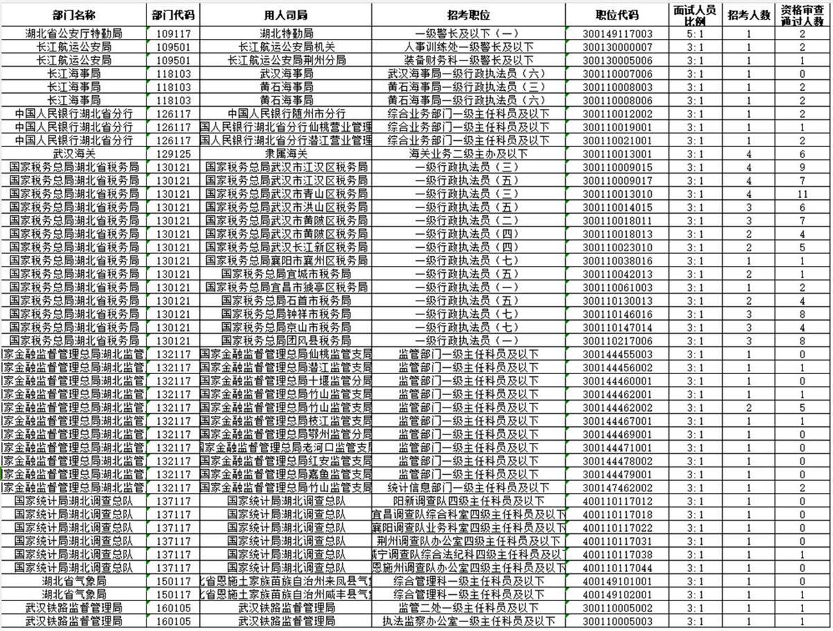 同样还可报名的单位有:中国人民银行随州市分行、湖北省分行仙桃营业管理部、湖北省分行潜江营业管理部,国家税务总局武汉市江汉区税务局、武汉市青山区税务局、武汉市洪山区税务局、武汉市黄陂区税务局、武汉长江新区税务局、襄阳市襄州区税务局、宜城市税务局、宜昌市猇亭区税务局、石首市税务局、钟祥市税务局、京山市税务局、团风县税务局,国家金融监督管理总局仙桃监管支局、潜江监管支局、十堰监管分局、竹山监管支局、枝江监管支局、鄂州监管分局、老河口监管支局、红安监管支局、嘉鱼监管支局、竹山监管支局,国家统计局湖北调查总队阳新调查队、宜昌调查队、襄阳调查队、荆州调查队、咸宁调查队、恩施州调查队,湖北省恩施土家族苗族自治州来凤县气象局、咸丰县气象局,武汉铁路监督管理局等。