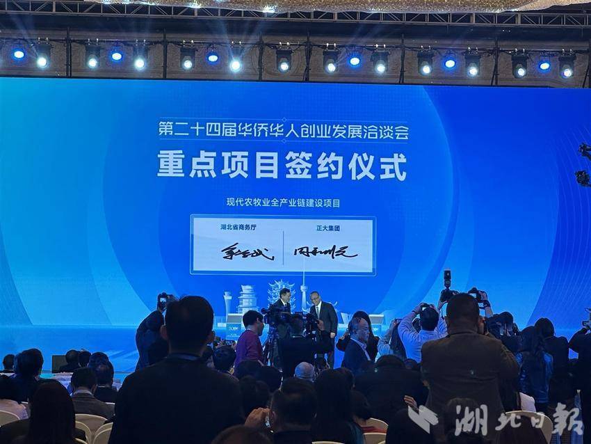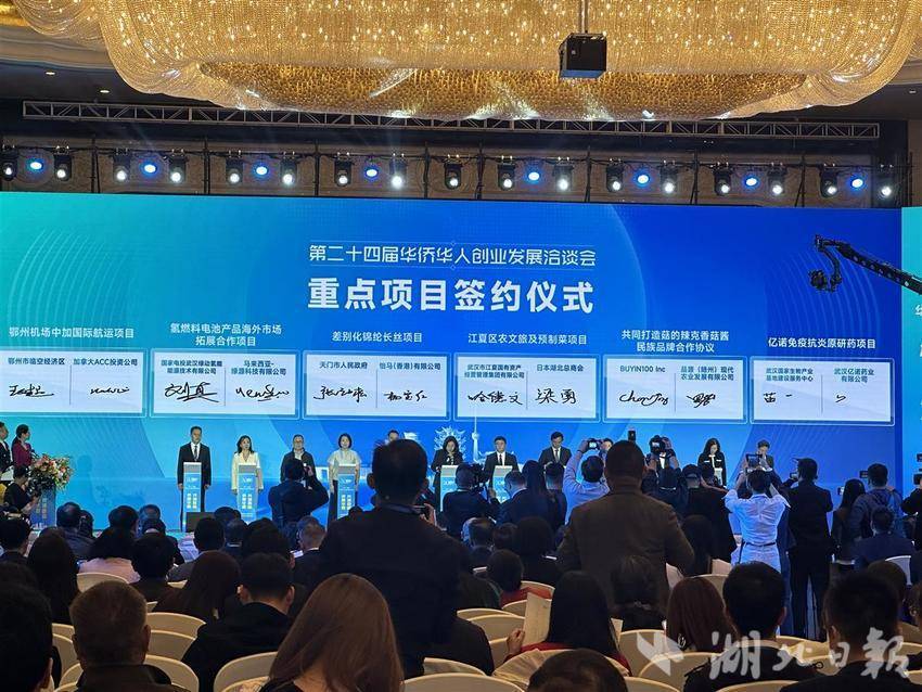 10月23日,第二十四届华侨华人创业发展洽谈会在武汉开幕。7个项目在开幕式现场签约,签约金额80亿元,包括现代农牧业全产业链建设项目、鄂州机场中加国际航运项目、氢燃料电池产品海外市场拓展合作项目等。