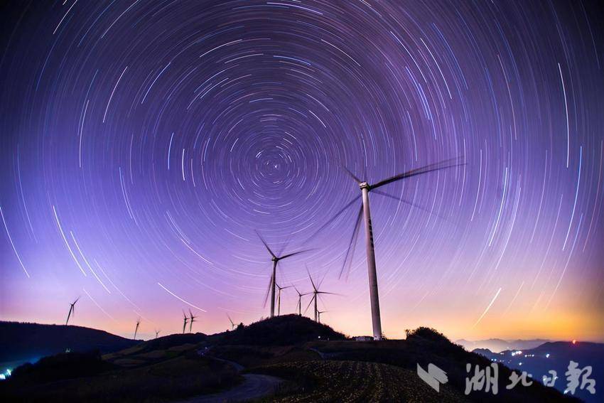 10月22日晚,秭归县云台荒风电场,风电机组与明净夜空、明亮繁星相映成景,构成一幅美丽的生态画卷。云台荒风电场位于宜昌市秭归县、长阳县交界之地——云台荒,有82台风电机组,装机容量180兆瓦。该项目建设将高山风电、生态修复、乡村旅游深度融合,把云台荒风电场建设成为高山观光、夏天避暑、冬天赏雪的新景区,从而保护三峡库区生态环境、带动乡村生态旅游发展,助力乡村振兴。(通讯员 郑坤)