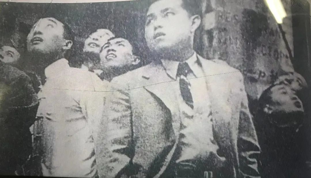 武汉会战期间,我空军与日机在武汉上空展开激战。武汉市民仰头观看空战的情形