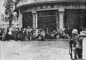 日军占领下的汉口中山大道,无辜的民众被手拿刺刀的日军驱赶,有家不能回