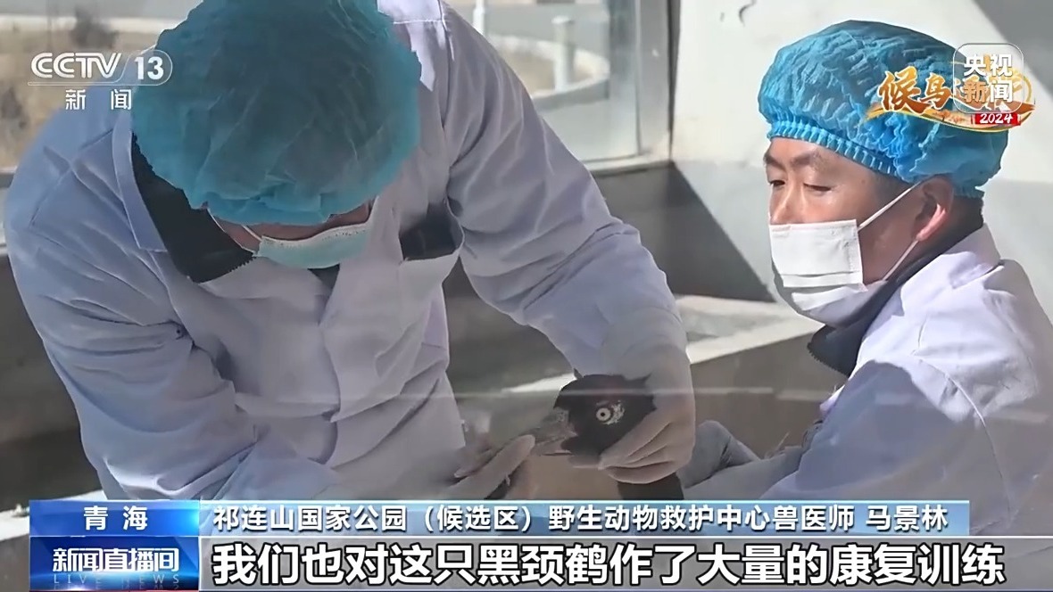 祁连山国家公园(候选区)野生动物救护中心兽医师 马景林:我们也对这只黑颈鹤作了大量的康复训练,从目前的恢复情况来看,它能够完成基本的飞行动作,但这并不意味着它能进行长途迁徙,因为在迁徙路上它不仅要能飞起来,还要能有效地寻找食物和躲避天敌。目前它显然不能跟着这次迁徙的大部队进行迁徙。