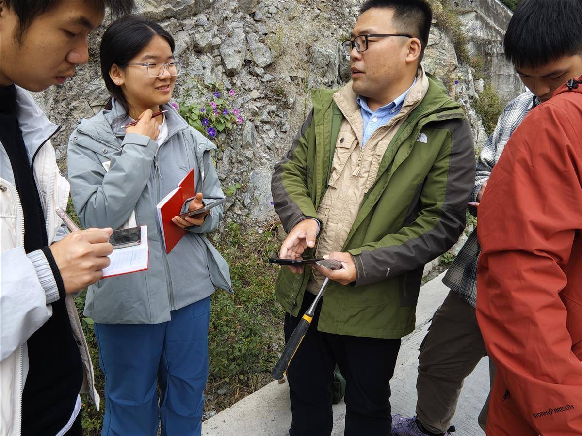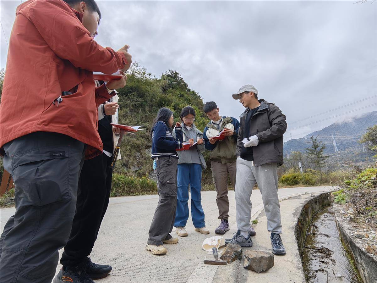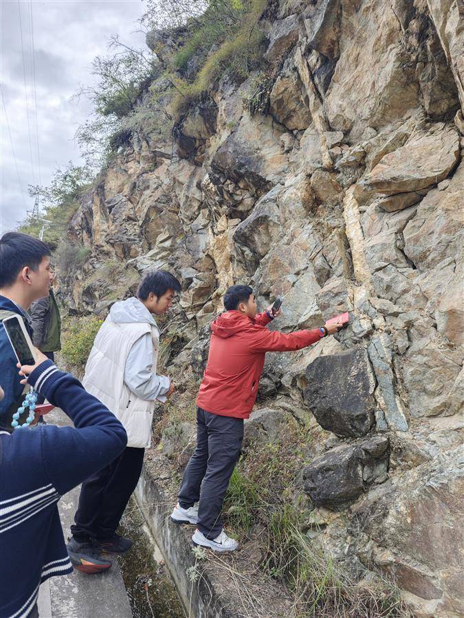 随队学生有不同年级的本科生和研究生,大家学习进度有差异,观测兴趣点也不同,岩石色彩的深浅、矿物的构成、甚至石块的重量,都令学生们好奇,“老师,为什么都是钾长石,有的肉色深、有的肉色浅?”“你看看这是什么,拿放大镜看看,好像是白云母,它们亮晶晶的!”