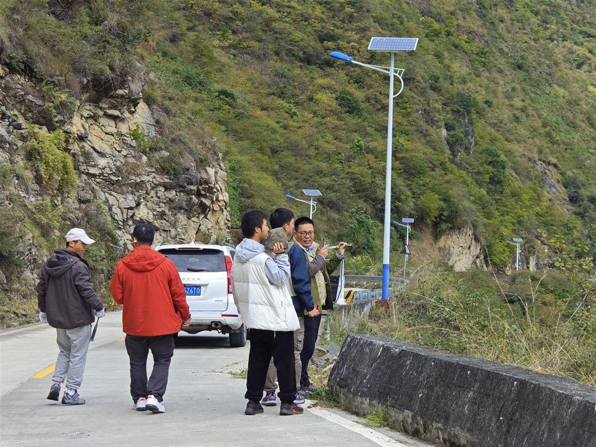 在团队出发的前几天,带队老师朱煜翔在团队群中发布了1.5G的文献材料,共队员们参考学习。首日考察,天还蒙蒙亮,王连训和朱煜翔就带着几位随队学生出发踏勘,提前确认采样地点。简单早饭后,团队7人便开始沿途采集,共设置了5个采样点位,除了记录观察所得的岩石岩性,还要查找不同岩石间的接触关系和形成顺序,并准确记录采样位置,方便后续研究对比。