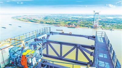 10月18日,建设者在双柳长江大桥北岸主墩顶部加紧施工。新港高速公路双柳长江大桥及接线工程概算投资159.78亿元,是我省投资建设规模最大的长江大桥项目。