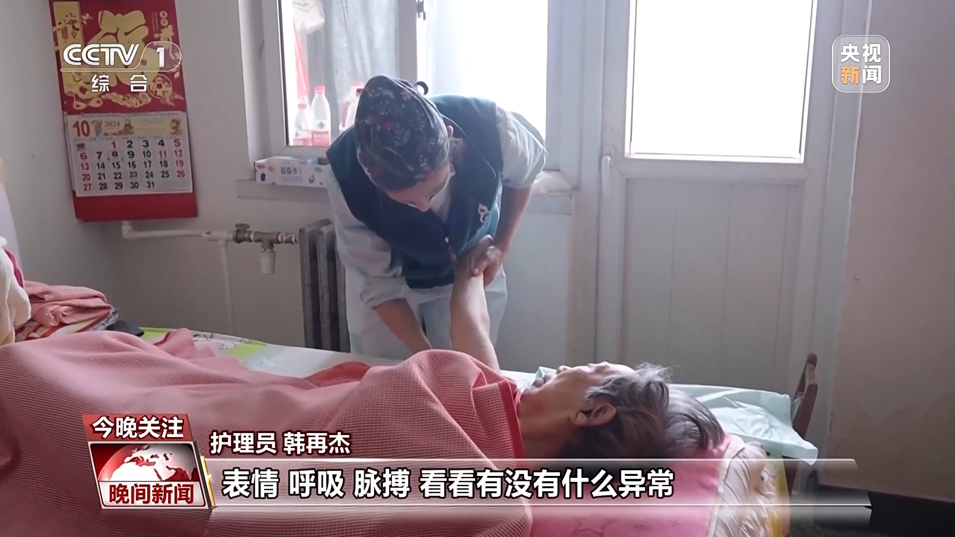 护理员 韩再杰:我们擦浴的时候,得随时观察老人的面部、表情、呼吸、脉搏,看看有没有什么异常,还有一些插尿管的、带鼻饲的老人,那些管路得注意到,以免管道打折、受压。