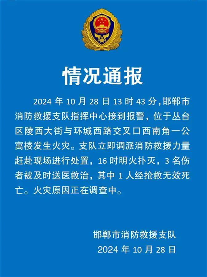 据邯郸市消防救援支队通报称,10月28日13时43分,位于丛台区陵西大街与环城西路交叉口西南角一公寓楼发生火灾。支队立即调派消防救援力量赶赴现场进行处置,16时明火扑灭,3名伤者被及时送医救治,其中1人经抢救无效死亡。火灾原因正在调查中。