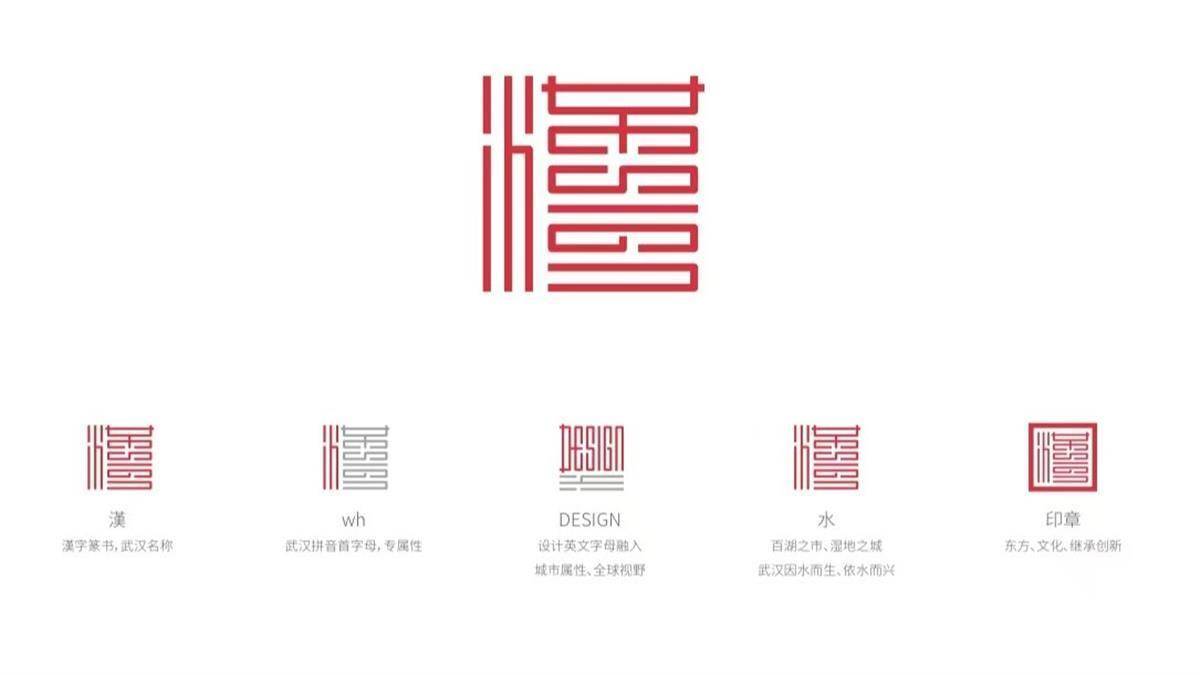 标识以繁体篆书“漢”字字形为主体,左侧三点水演化为武汉的拼音“w h”之形,强调地域专属性;右侧主体在传统中国文化美学中巧妙植入英文“DESIGN”,直观表现武汉设计之都的定位。整体东情西韵,形似印章,字体结构专业、大气、简洁,整体造型古朴厚重,展现大江大湖大武汉的雄浑壮阔之美,同时和联合国教科文创意城市网络标识的设计风格相呼应,体现中西文化的不同和融合。武汉设计之城寓意表现到位,反映出武汉城市文化地理特征、产业特征,延展开也有很多变化可能,符合设计之都城市标识的气质。