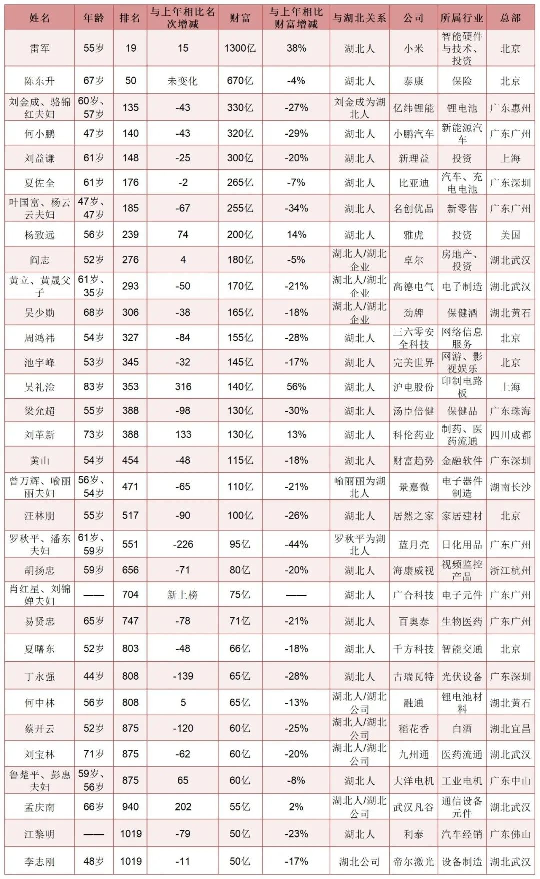 支点财经记者梳理榜单发现,30余位湖北籍企业家上榜,今年55岁的湖北仙桃人雷军,因创立了小米以1300亿元财富位列湖北籍企业家榜首。