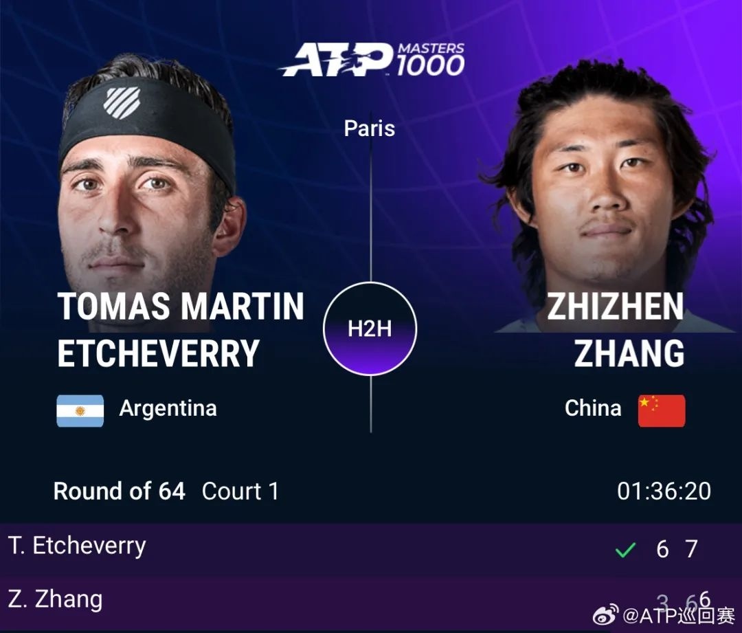北京时间10月28日晚,ATP1000巴黎大师赛男单首轮比赛中,张之臻以3:6/6:7(6)不敌埃切维里,无缘晋级第二轮。