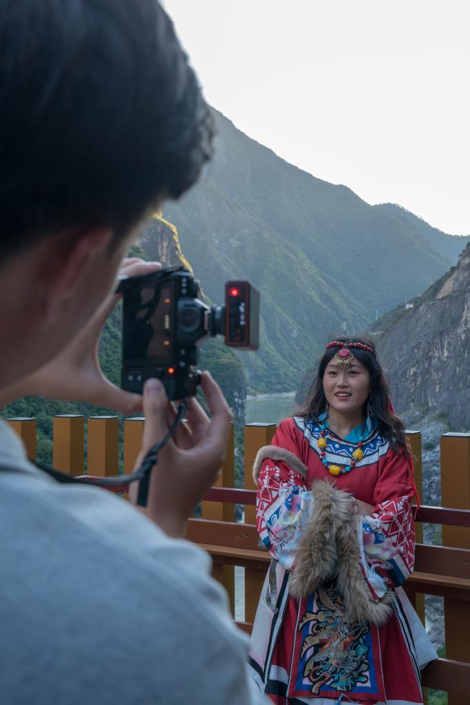 10月27日,游客身着民族服饰在虎跳峡景区拍照留念。新华社记者 彭奕凯 摄