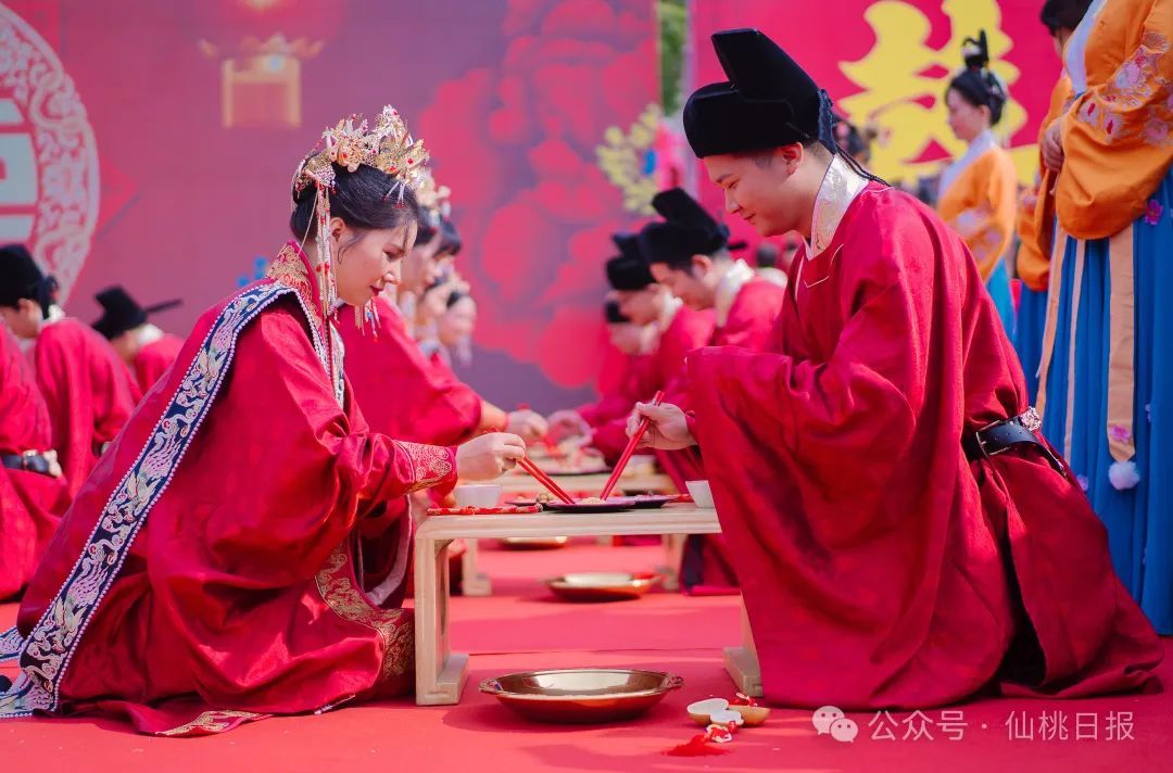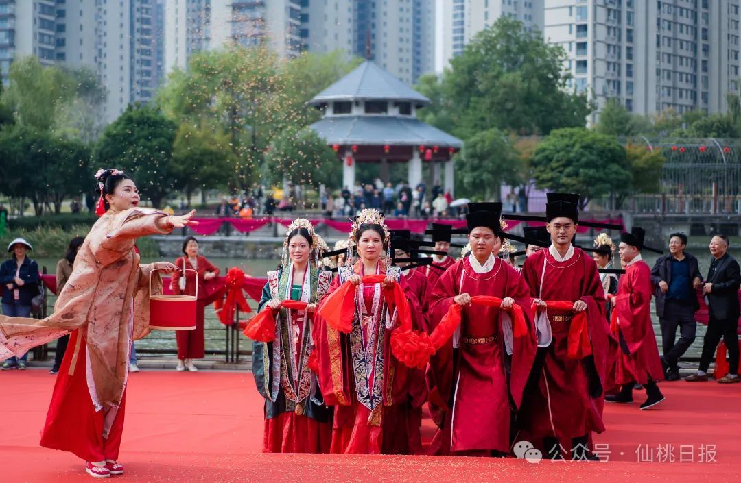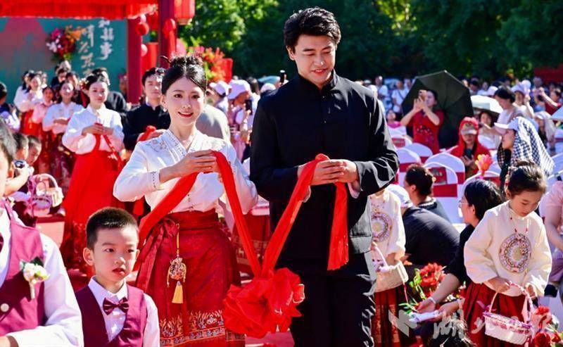 10月27日上午,2024年仙桃第三届集体婚礼在沔阳公园举行。15对新人在浓浓的中式浪漫中,圆满完成集体婚礼,共缔白首之盟、赴百年之约。