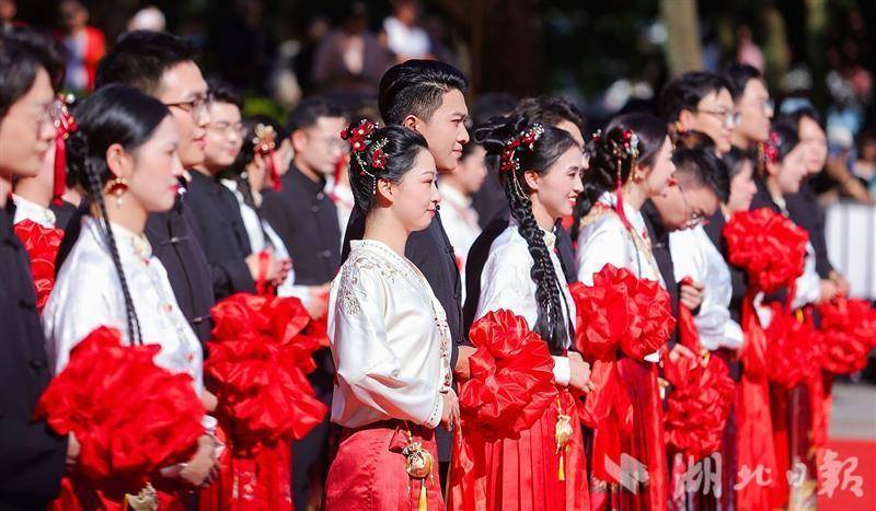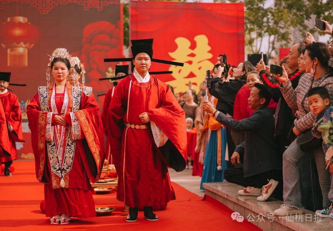 亲迎礼、出阁礼、交拜礼、却扇礼、合卺礼、婚书盟誓、执手礼、告天之礼……新人们在主持人的引导下,一步步沉浸式体验宋制婚嫁仪式,共同翻开人生幸福新篇章。